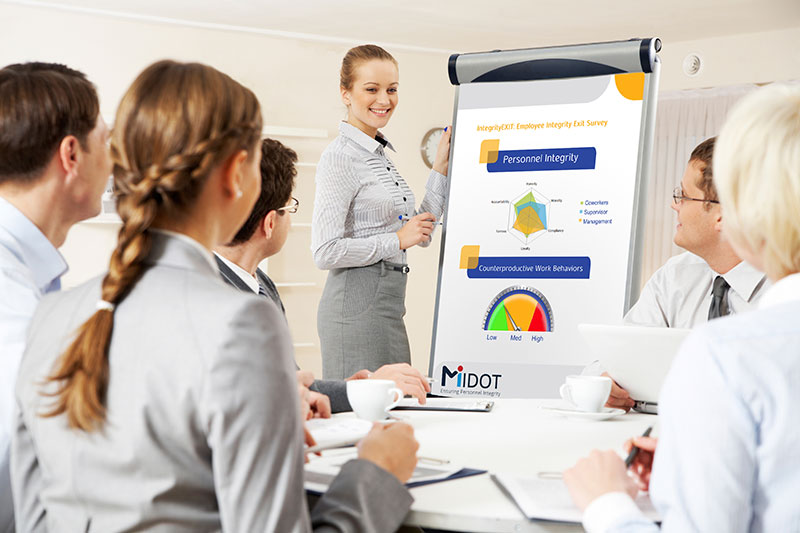 Midot’s IntegriEXIT survey is designed to assess counterproductive and unethical behaviors via employees who leave the company, whether resigned or dismissed.
