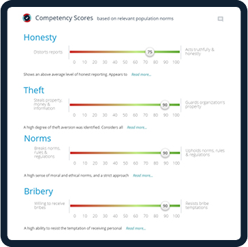 Low integrity may lead to occupational offenses; theft of property, money or information, bribery and rule breaking. Leading scientific studies have demonstrated that integrity tests not only predict risky behavior, but also overall job performance! Midot IntegriTEST is a web-based integrity test that allows you to evaluate your candidates’ risk of occupational offenses by assessing their attitudes, opinions, and past behaviors.