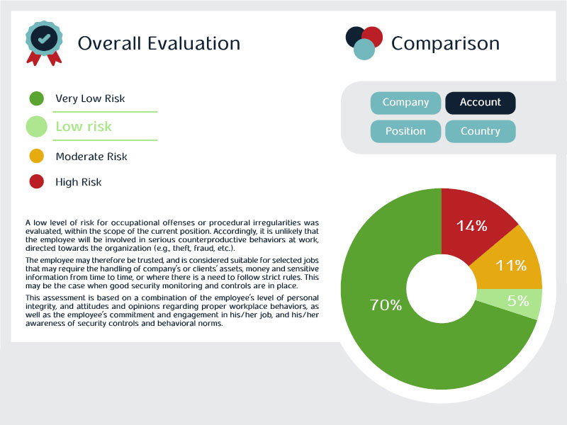 Trustworthy employees are essential to every business. They contribute to the profitability, service and reputation of an organization. According to most estimates, at least a third of employees are involved in counterproductive work behaviors, which often go undetected. Counterproductive work behaviors are influenced not only by an employee’s integrity and values, but also by situational factors at work, such as satisfaction, norms and security controls. What’s more, these factors may evolve throughout the employee’s employment period, due to a range of possible changes in his or her job (e.g., position, supervisor) the organization (e.g., mergers, restructuring) or personal life (e.g., debts, addictions). Therefore, assessing employees’ risks of counterproductive behaviors should be carried out periodically, taking into consideration that the level of risk may not stay constant. Furthermore, these assessments can point out weak links and problematic norms on a company level or department level that can be later influenced through corrective actions. TRUSTEE is recommended for:
